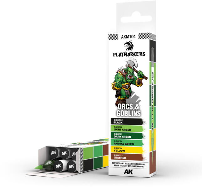AK Interactive PLAYMARKER SET - ORCS & GOBLINS Professzionális Makettfesték A Orcs & Goblins Playmarker Set az AK Interactive megoldása azok számára, akik gyorsan , precízen és tisztán szeretnének festeni zöld bőrű figurákat – legyen szó orkokról vagy goblinokról. A készlet hat akril festéktollat tartalmaz, melyek a játékfigurák és diorámaelemek kiemelését teszik egyszerűvé. A készlet színei: