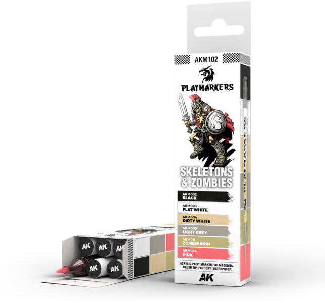 AK Interactive PLAYMARKER SET - SKELETONS & ZOMBIES Professzionális Makettfesték A Skeletons & Zombies Playmarker Set egy professzionális , ecsethegyű filctollas akril festékkészlet, melyet kifejezetten csontváz- és zombifigurák gyors, tiszta festésére fejlesztett ki az AK Interactive . A készlet színei: