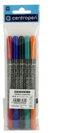 Speciális jelölő CENTROPEN 3616 Double, két különböző heggyel, CD, DVD, BD lemezek címkézésére tervezve. Háromszög alakú ERGO markolat mindkét oldalon. Alkohol alapú tartós tinta. Hengeres csúcs – 2,5 mm alapterületű. Finom hegy - a jelölés szélessége 0,6 mm. 4 + 1 db-os készlet.