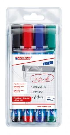 Marker vízbázisú tintával és a Cap off funkcióval, amely megakadályozza a tinta kiszáradását még több napig is, ha a toll nyitva van. Flipchart lapok és egyéb papírlapok címkézésére. Újratölthető FTK 25 tintával, amely nem kerül át a papír másik oldalára. A csúcs le van vágva, a nyom szélessége 1-5 mm. 4 db-os szett színkeverékben. Szín: 4 szín keveréke Nyomszélesség: 1,5-3 mm Tipp típusa: csonka