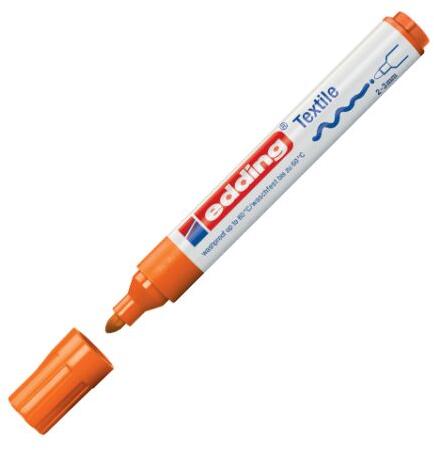 Marker textilekhez, közepes vastagságú kerek hegyű. Szagtalan vízbázisú tintával töltve. A színeket száraz vasalással kell rögzíteni. Rögzítés után a színek 60°C-ig moshatóak. Nyomszélesség: 2-3 mm. Szín: narancs.