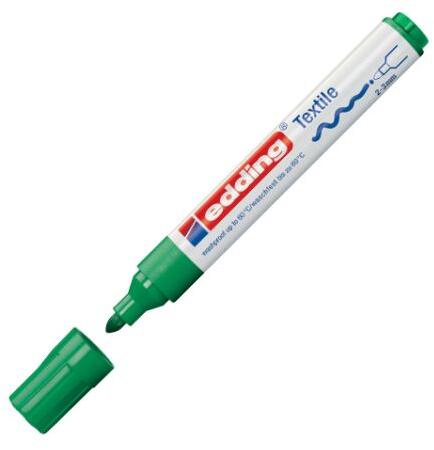 Marker textilekhez, közepes vastagságú kerek hegyű. Szagtalan vízbázisú tintával töltve. A színeket száraz vasalással kell rögzíteni. Rögzítés után a színek 60°C-ig moshatóak. Nyomszélesség: 2-3 mm. Szín: zöld.