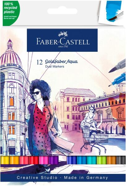 Faber-Castell Goldfaber oldható marker, 2 végű, 12 db/szett Marker vízbázisú tintával, két heggyel. Puha, rugalmas ecsetvégek a művészi munkákhoz, finom vonalzó a kontúrokhoz és részletekhez. Finomító hegy vastagsága 0,4 mm. Vízben teljesen oldódik. A színek nem adódnak át papíron. Szagtalan, savmentes, semleges pH. A burkolat és a test anyagból készült. 100%-ban újrahasznosított (ezért kis színváltozatok lehetségesek) a gyártás során. 12 színből álló készlet.