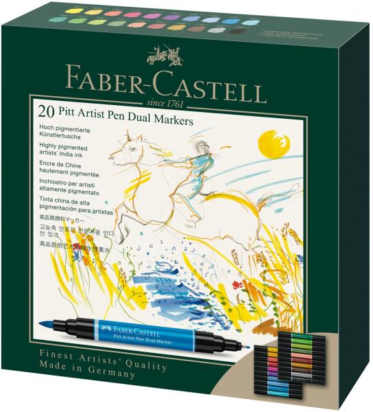 Faber-Castell Pitt Artist Pen Dual Vízbázisú tinta, erős pigmentek. Két hegy: finom (bélés) és ecset. Puha, ecsetszerű hegy művészi munkákhoz. Fémbe ágyazott béléshegy (0.8 mm) a részletekért és a vonalakért. A tinta nem jut át a papíron. Fényálló színek. Németországban készült. 20 színből álló készlet.