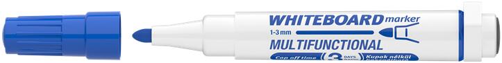 Multifunkciós táblamarker: - mágneses fehértáblára való írásra, rajzolásra. - speciális festékanyagának köszönhetően, néhány napig, kupak nélkül sem szárad be. -a kupakban elhelyezett mágnes révén, acél táblafelületeken rögzíthető. - az írás szárazon letörölhető, melyet a kupak végén található táblatörlő korong is segít. Kerekített csúccsal. Vonalvastagság: 3 mm. Katalóguskód: 19364