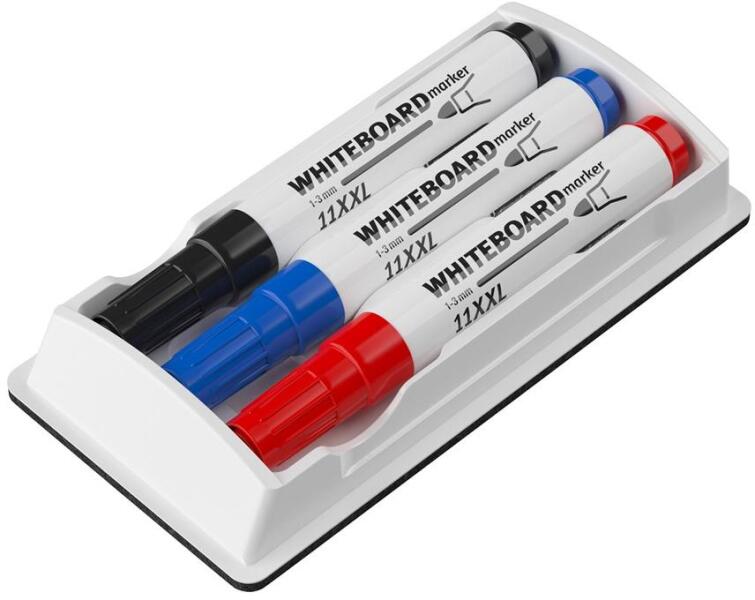 A táblamarkerrel fehér táblára írt szövegek és ábrák eltávolítására. Filc törlőfelület. A táblatörlő tartalmaz 3 db táblamarkert kék, piros, fekete színben. Katalóguskód: 59982