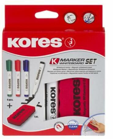 KORES Tábla- és flipchart marker készlet mágneses táblatörlő szivaccsal, 3-5 mm, vágott, KORES "XW2", 4 különböző szín (20865)