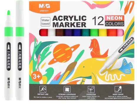 12 akril marker készlet széles felhasználási lehetőséggel. - vászonra, papírra, üvegre, kerámiára, fára, szövetre - gazdag neon színek, száradás utáni fakulásnak ellenálló, vízálló - azonnali használat (nem kell rázni vagy megnyomni) - vízbázisú pigment
