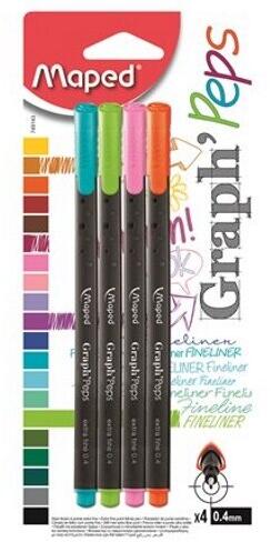 MAPED Tűfilc készlet, 0,4 mm, Graph`Peps, 4 különböző vidám szín vékony és pontos írásvízbázisú festékkel töltvea rozsdamentes hegy folyamatos írásképet eredményezháromszög alak a könnyebb használat érdekébenfekete, műanyag tolltesta tollvég és a kupak színe megegyezik a tinta színévelvonalvastagság: 0,4 mmszínek: pink, narancssárga, almazöld, kék lagúna