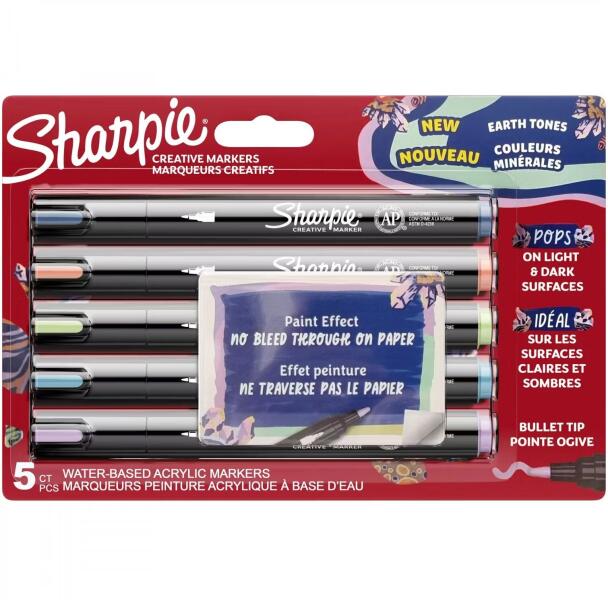 Sharpie kreatív akril marker készlet, 5 db, Pasztell Sharpie kreatív akril marker készlet földszínekben, 5 darabos. 5 db vízbázisú marker finom földszínekben. Vízbázisú markerek, nem folynak át a papíron. A színek rétegezhetők keverés nélkül. Kerek hegy a különféle kreatív projektekhez. Festékszerű hatás – világos és sötét felületeken is látható.