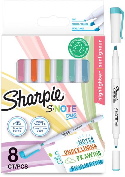 Sharpie S-Note pasztell kreatív marker készlet, 8 db „A Sharpie S-Note Duo arra inspirál, hogy a hétköznapi felületeket szenvedélyes kreatív kijelentésekké alakítsa. - Marker és kreatív szövegjelölő egyben, két heggyel (kerek és ferde hegy), tökéletes finom és vastag vonalak rajzolásához. - Az intenzív élénk színek élénk benyomást keltenek- Használható papíron, műanyagon, fémen és sok más felületen- Gyorsan száradó, fakulás- és vízálló tinta- Finom tollhegy, számtalan felhasználásra tökéletes az osztályteremben, irodában, otthon és azon kívülTartalom:- 8 állandó marker készlet 2 Sharpie S-Note Duo hegyévelrészletek:Polikarbonát műanyag tartozékok. Polikarbonát műanyag konzolPolikarbonát műanyag bevonat tintával. Fehér polikarbonát műanyag ház. Polikarbonát műanyag fogantyú