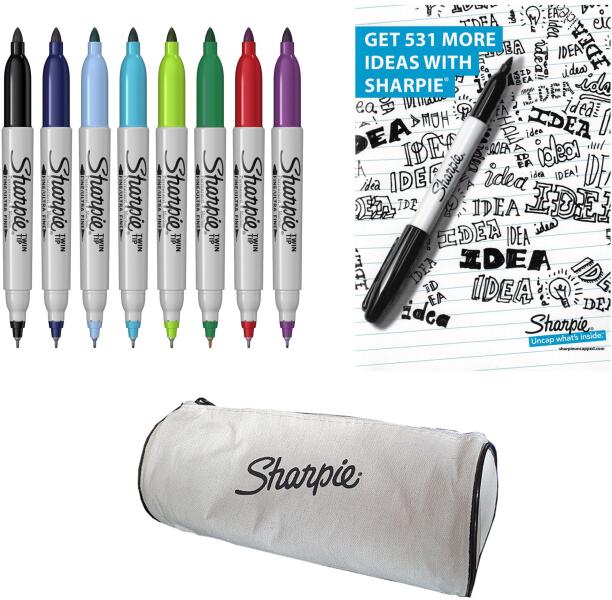 Sharpie Twin Tip Tartós filctoll készlet, 8 db + A5 jegyzetfüzet + Sharpie toll A Sharpie tartós filctollak arra inspirálnak, hogy a hétköznapi felületeket szenvedélyes kreatív felületekké alakítsd. - Az intenzív élénk színek élénk benyomásokat keltenek; - Használható papíron, műanyagon, fémen és sok más felületen; - Gyorsan száradó, fakulásnak és víznek ellenálló tinta; - Két hegy, az egyik vékony és a másik extra vékony, számtalan felhasználásra tökéletes az osztályteremben, az irodában, otthon és azon kívül. Tartalom: - 8 Sharpie Twin Tip tartós filc; - A5-ös jegyzetfüzet; - Sharpie toll. Részletek: Finom filchegyek, kerek és tű típusú; Az extra vékony hegy 0,9 mm F, a vékony hegy 0,5 mm XF.