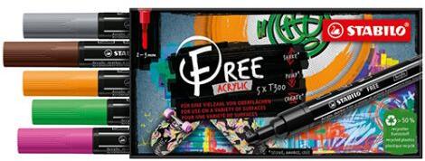 A STABILO FREE Acrylic Marker termékcsaláddal szinte korlátlanul tervezhet és személyre szabhat. A markerek három, gondosan kiválasztott tokváltozatban és akár 20 borítószínben kaphatók. Átlátszatlan és fényálló pigmentált akrilfesték, amely szinte minden felületre alkalmas, a papírtól a kőig a kerámiáig, műbőrig és fáig. Mindenki szabadjára engedheti kreativitását írás, festés, jelölés, sraffozás és kontúrozás közben. Akril marker pigmentált vízbázisú tintával - három nyomszélességben (T100, T300, T800C) akár 20 színben - különböző felületekre, pl. papír, karton, vászon, kő vagy műbőr - átlátszatlan, tartós, vízálló, könnyű és időjárásálló - keverhető és keverhető vízzel - szárazon selymesen matt és festhető - 50%-ban újrahasznosított műanyagból készült - Könnyű aktiválás utánrázással 30 másodperc, majd szivattyúzás – vízszintes tárolás a hosszú élettartam érdekében