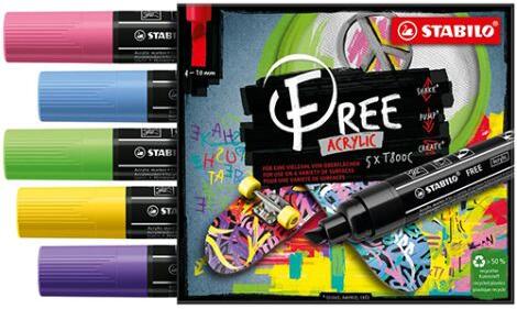 A STABILO FREE Acrylic Marker termékcsaláddal szinte korlátlanul tervezhet és személyre szabhat. A markerek három, gondosan kiválasztott tokváltozatban és akár 20 borítószínben kaphatók. Átlátszatlan és fényálló pigmentált akrilfesték, amely szinte minden felületre alkalmas, a papírtól a kőig a kerámiáig, műbőrig és fáig. Mindenki szabadjára engedheti kreativitását írás, festés, jelölés, sraffozás és kontúrozás közben. Akril marker pigmentált vízbázisú tintával - három nyomszélességben (T100, T300, T800C) akár 20 színben - különböző felületekre, pl. papír, karton, vászon, kő vagy műbőr - átlátszatlan, tartós, vízálló, könnyű és időjárásálló - keverhető és keverhető vízzel - szárazon selymesen matt és festhető - 50%-ban újrahasznosított műanyagból készült - Könnyű aktiválás utánrázással 30 másodperc, majd szivattyúzás – vízszintes tárolás a hosszú élettartam érdekében