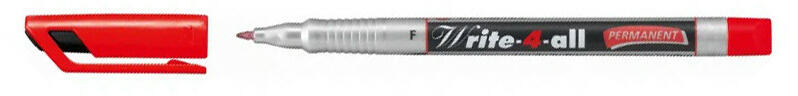 Stabilo Write-4-all permanent marker . Tartós műanyag hegy ű filctoll, praktikus klippel. A hagyományos filctollaknál tartósabb hegy - kemény felületeken is tisztán és jól láthatóan ír - ideális a CD-k és DVD-k kíméletes címkézéséhez. Több, mint 1000 felületen tesztelt írásképesség , pl. üveg, műanyag, fénykép, kerámia, fólia vagy fém. Ez a tartós jelölőtoll még szélsőséges körülmények között (hidegben, hőségben és esőben) is megbízható teljesítményt nyújt, ideális a kertben, az üvegházban vagy akár a hűtőkamrában történő használatra. Írásvastagság: F . Szín: piros .