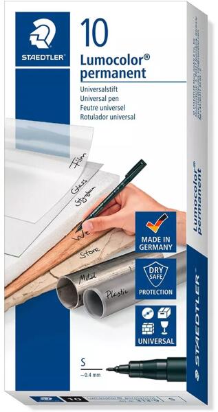 STAEDTLER Lumocolor permanens marker - Fedezze fel az univerzális írási megoldást Ismerje meg a STAEDTLER Lumocolor permanens markert , ami igazi univerzális segítőtárs az irodában, otthon vagy még kreatív projektek során is. A marker 0,4 mm-es vonalvastagsága lehetővé teszi a precíz és tiszta írást, melynek köszönhetően minden részlet kirajzolódik. A szett 10 darab fekete színű tűfilcet tartalmaz, melyek kifinomult és elegáns megjelenést biztosítanak. Kiemelkedő tulajdonságok és felhasználhatóság Ez a marker szinte minden felületen használható. Legyen szó írásvetítő fóliákról, CD/ DVD-lemezekről, üvegről, fémről vagy műanyagról, a Lumocolor permanens marker mindenhol tökéletes választás. A tinta vízálló és nem kenődik , így használat után az eredmény hosszasan megmarad, amint gyorsan megszárad, ezért különösen ajánlott balkezes felhasználóknak is. Az alkoholbázisú tinta enyhe illatú , így használata kényelmes és kellemes élményt nyújt. Továbbá a fekete szín fényálló és időjárásálló, ellent áll az UV-fénynek, esőnek és víznek. Tervezés és fenntarthatóság A tolltest és a kupak anyaga polipropilén, ezáltal biztosítva a termék hosszú élettartamát . A "Dry Safe" technológia révén a marker napokig nem szárad ki kupak nélkül, így nem kell aggódnia, ha véletlenül nyitva felejtené. A repülésbiztos kialakítás megelőzi a tinta elszivárgását még magas nyomás alatt is, ami utazás közben különösen hasznos. A tinta xilol és toluol-mentes , így egészség- és környezettudatos választás. Élvezze az intenzív fekete színt, ami minden alkalmazásnál éles és markáns vonalakat eredményez. Érdekességek a STAEDTLER márkáról A STAEDTLER cég Németország egyik legrégebbi irodaszer gyártója, mely több mint 180 éves szakmai tudással rendelkezik. A cég a minőségi kézíró eszközök mellett elkötelezett a környezetvédelem iránt, folyamatosan fejlesztve zöld termékcsaládját és fenntartható gyártási eljárásait. A STAEDTLER Lumocolor permanens marker nem csak egy íróeszköz, hanem egy megbízható társ minden helyzetben. Fedezze fel Ön is a precíz és tiszta írást biztosító STAEDTLER markereket, és lépjen be a minőség és innováció világába!