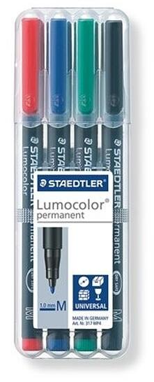 Univerzális marker, szinte minden felületen használható. Tökéletes írásvetítő fóliákhoz, CD/DVD-lemezekhez, üveg, fém és műanyag felületekhez. A legtöbb felületetn vízálló, nem kenődik; gyorsan szárad, így balkezeseknek is ajánlott. Alkoholbázisú tinta, enyhe illatú. A fekete szín fényálló és időjárásálló (ellenáll az esőnek és az UV fénynek). Polipropilén tolltest és kupak a hosszú élettartamért. "Dry Safe": napokig nem szárad ki kupak nélkül. A kupak színével megegyező tinta. Repülés biztos: automata nyomás-kiegyenlítő, megelőzi a tinta elszivárgását repülés közben. Xilol és toluol-mentes tinta. Intenzív színek. Vonalvastagság: 1 mm. Utántölthető, felállítható STAEDTLER dobozban.