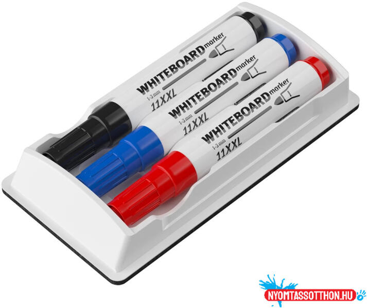 A táblamarkerrel fehér táblára írt szövegek és ábrák eltávolítására. Filc törlőfelület. A táblatörlő tartalmaz 3 db táblamarkert kék, piros, fekete színben.