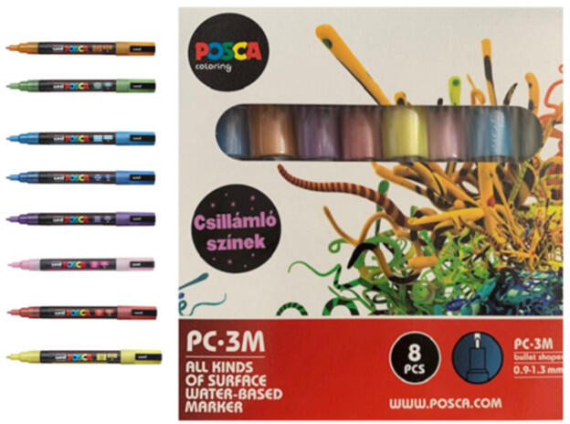DEKORMARKER 0,9-1,3MM, UNI POSCA PC-3M 8 DB-OS KÉSZLET, CSILLÁMLÓ