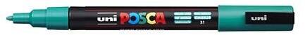 Kreatív innováció, a festőmarker. Ajánlott írásra, rajzolásra, festésre, jelölésre, díszítéshez, hobbihoz, művészethez, munkához. Főbb jellemzői: Festéke vízbázisú, nem üt át a papíron, üvegről könnyen lekaparható, oldószermentes és szagtalan. Alkoholmentes, vegyileg nem aktív, gyorsan szárad, hosszú igeig színtartó, UV álló, titándioxid alapú festék száradás után vízálló, nagy fedőképesség. A POSCA segítségével csaknem minden felületen, anyagon szabadon fejtheti ki kreativitását. 54 anyagon tesztelve. Az UNI POSCA festékei higítás nélkül is keverhetők, így hozhatunk létre saját, egyéni színeket. A tollak színei száradás előtt vízes ecsettel összemoshatók és folyathatók, így akvarell - lazúros, áttesző - hatás érhető el. A festéknek kitűnő a fedőképessége, ezért alapozásra nincsszükség. Hosszú távon fakulásálló. Használati tudnivalók:Párszor erőteljesen rázza meg a markert - kupakkal együtt!A tartályban lévő golyó fel-, és összekeveri a festéket az egyenletes sűrűség és szín érdekében. Addig nyomogassa egy felülethez a hegyet, amíg az átitatódik festékkel. Használat után helyezze vissza a kupakot, ez növeli a tinta élettartamát és megvéd a nem kívánt festékfoltoktól. Az UNI POSCA íróhegye vízzel tisztítható, megfordítható és cserélhető. Filc: kúpos hegyű. Vonalvastagság: 0,9 - 1,3 mm (FINE). Tollszáranyaga: műanyag (PP). Egyéb: tinta színével megegyező kupak. Minden termék vonalkódozva van. 31 színben kapható (standard: arany, ezüst, bronz, fekete, fehér, piros, kék, zöld, sárga, barna, narancs, szürke, almazöld, viola, rózsaszín, világoskék, ragyogó sárga, világosnarancs, világoszöld, égszínkék, smaragd, világosrózsaszín, palaszürke, bézs, vörösbor, elefántcsont, khaki, tengerészkék, sötétbarna, fukszia, opcionális: lila). Tinta színe: smaragd zöld.