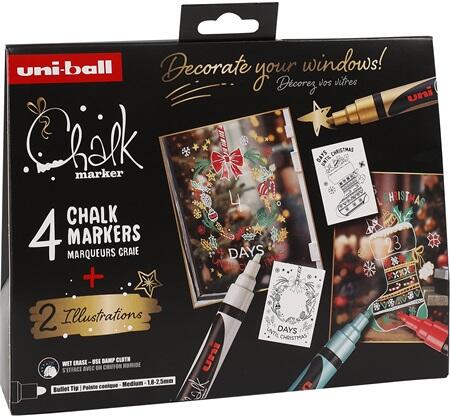 uni Folyékony krétamarker készlet, karácsonyi 4db/csomag UNI PWE-5M 1, 8-2, 5mm hegy fehér, arany, metál zöld, piros