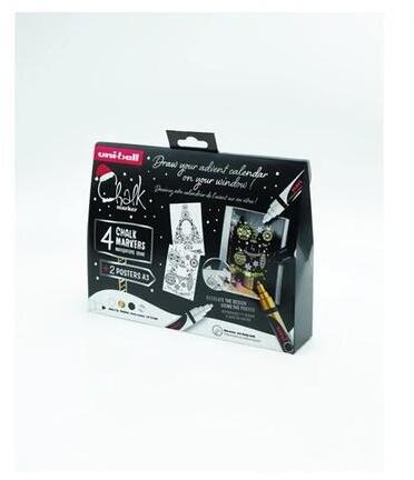 Készítsen karácsonyi ablak dekorációt az Uni folyékony krétáival!  A krétamarkerek mindenféle projekthez kiválóak - különösen hatékonyak az üvegen.  Természetesen papírra és kartonra is használhatjuk őket, ha hagyományos színes tollként szeretnénk alkalmazni őket. De az folyékony krétájával kapcsolatban az a csodálatos, hogy kültéren és beltéren egyaránt alkalmazható, mivel esőálló. A készletben található 2db A3-as papír sablon, melynek segítségével bárki könnyedén készíthet ablak dekorációt karácsonyra. A felrajzolt minta tartós, elég a karácsonyig hátralévő napok számát letörölni (nedves ruhával). Gömb hegyű, vonal vastagsága: 1,8-2,5mm.